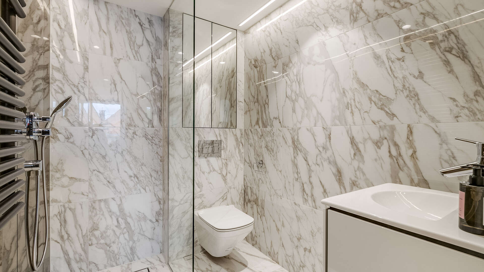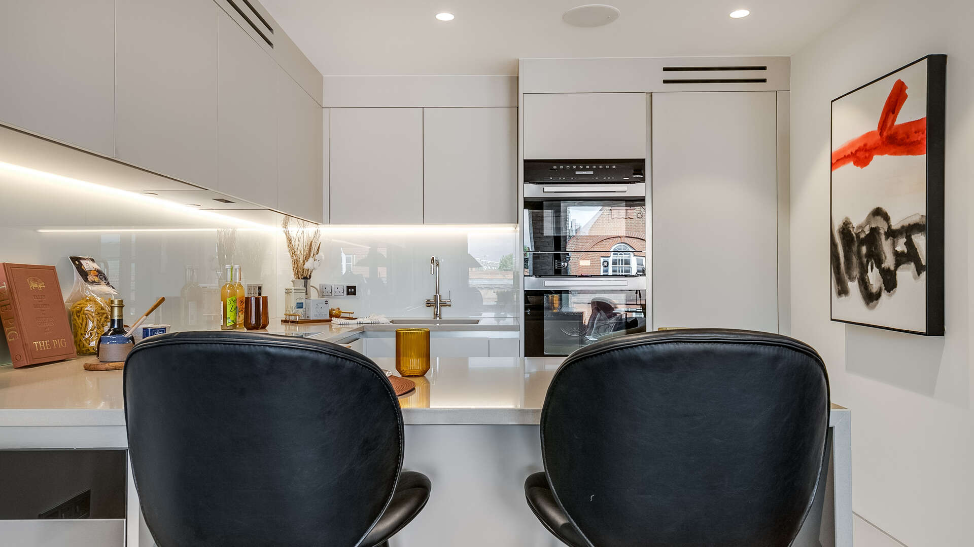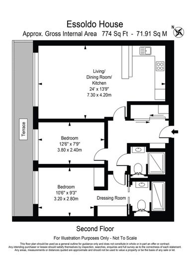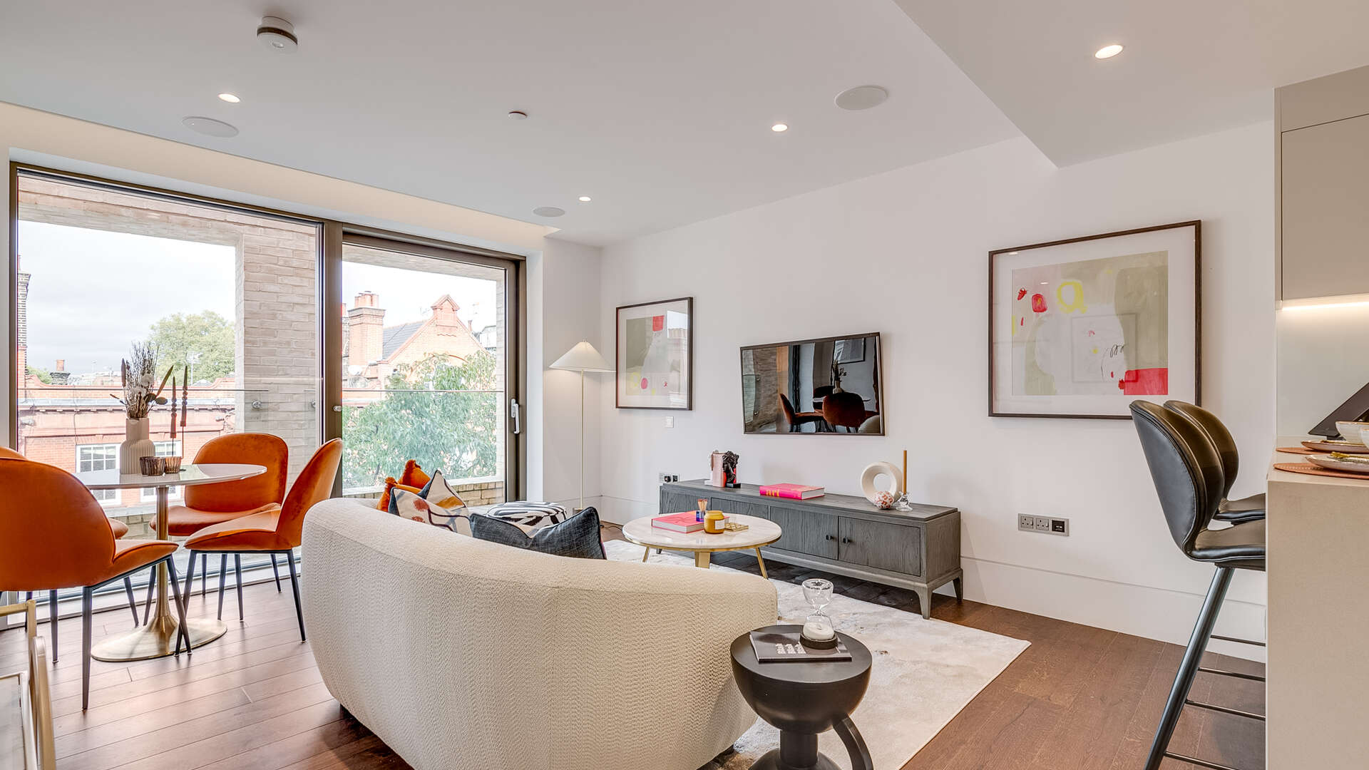 A very bright 2-bedroom apartment on the second level with private balcony overlooking the Kings Road. Triple glazing on this floor ensures total sound proofing. The living room combines contemporary and spacious space with a super smart fully fitted open plan kitchen with breakfast bar and Miele appliances including a wine-cooler. The principal bedroom has an en-suite dressing room and shower room. Smart home technology ensures central control via a central I-pad for temperature control, air cooling, and surround sound in every room. Dark European wood flooring throughout. Carrara marble in the 2 bathrooms.